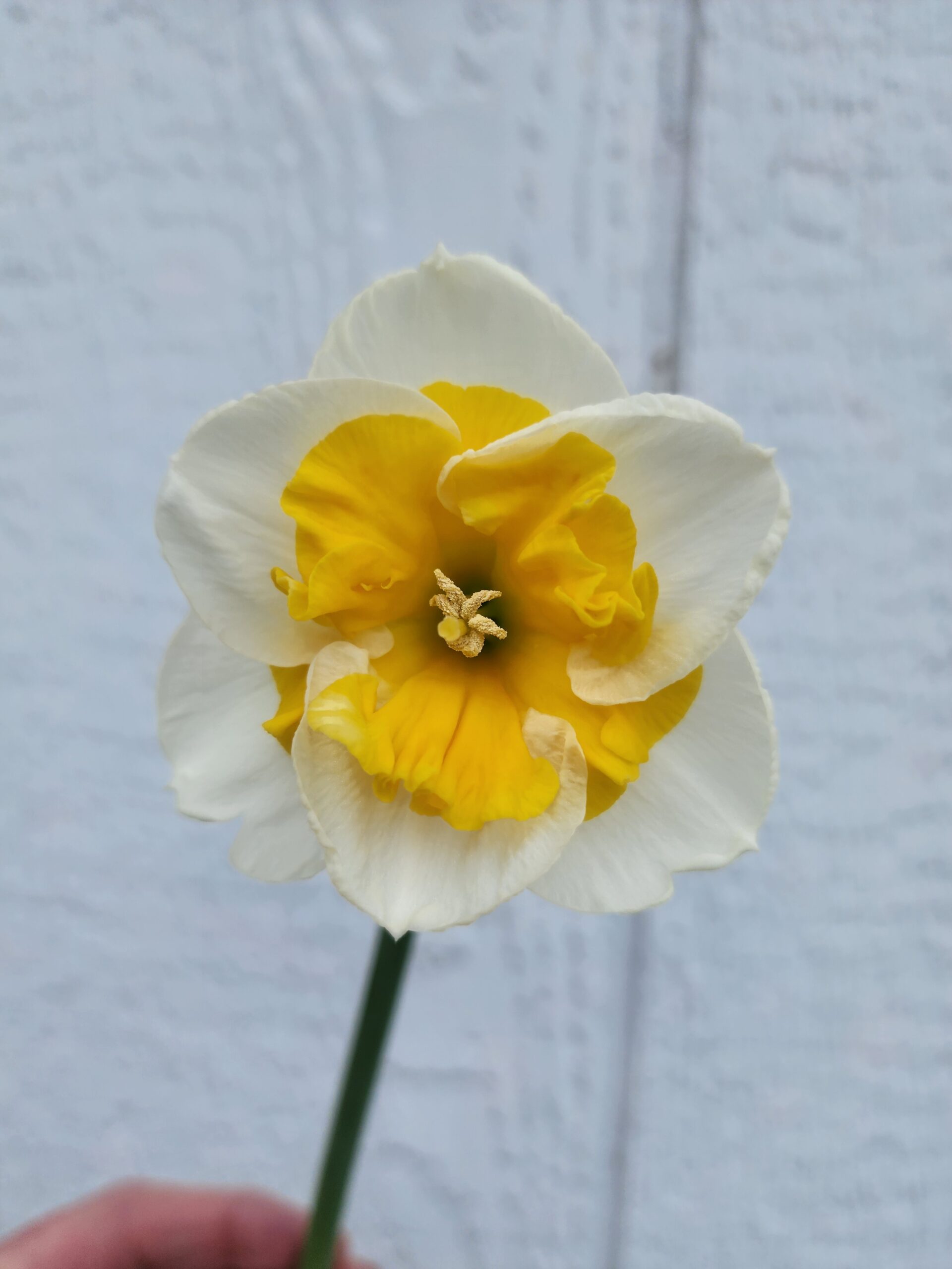 This daffodil is a split corona daffodil. The center is supposed to be a peachy salmon color, but they are reading more yellowy